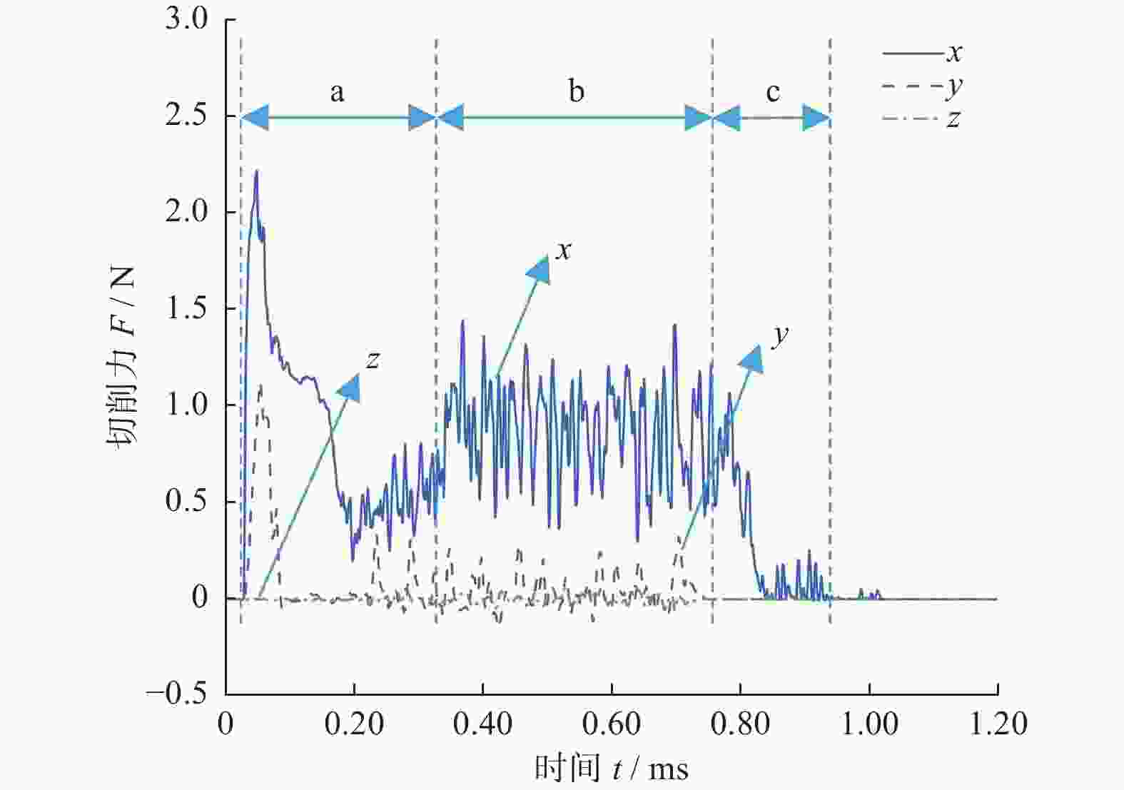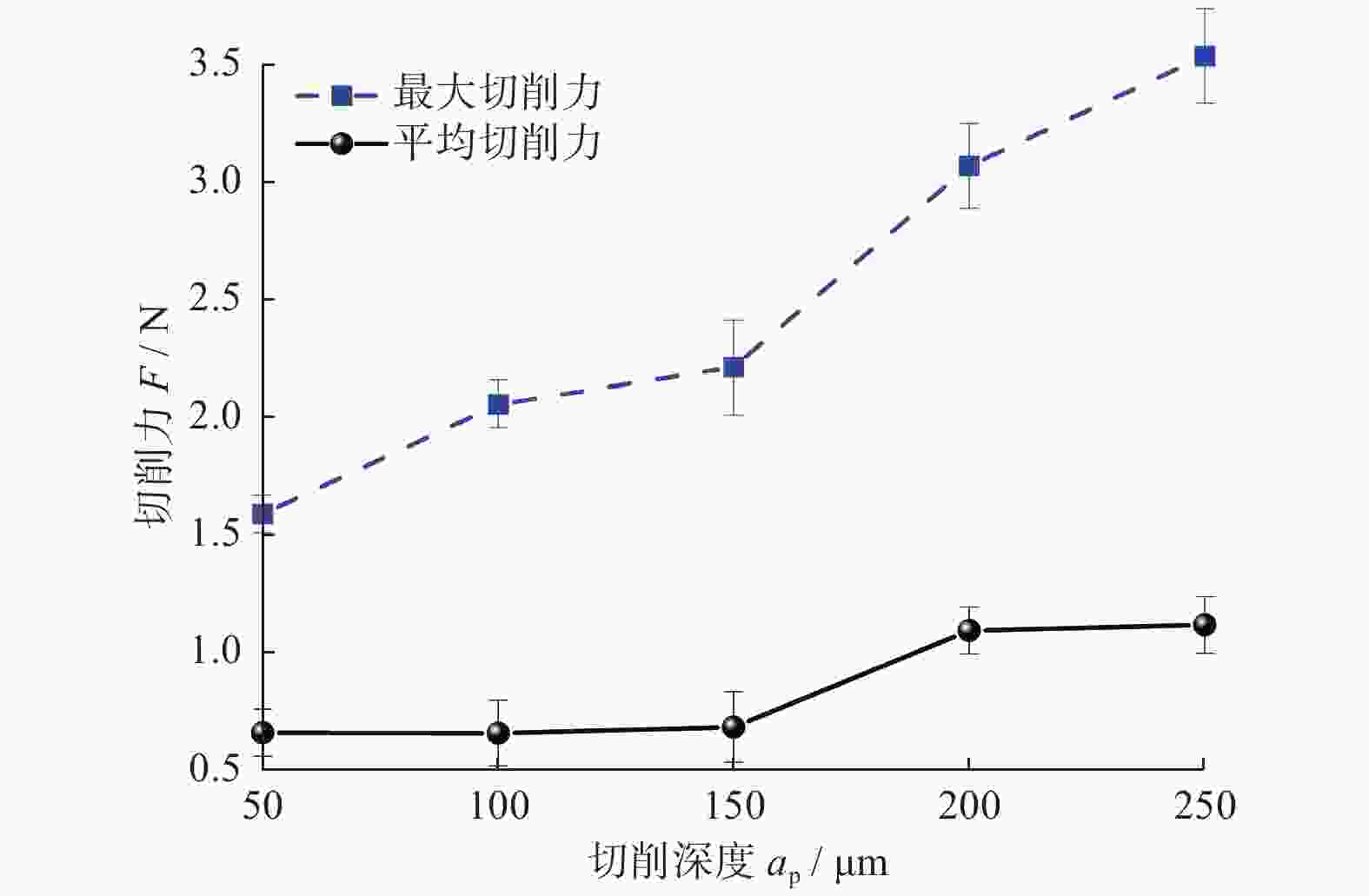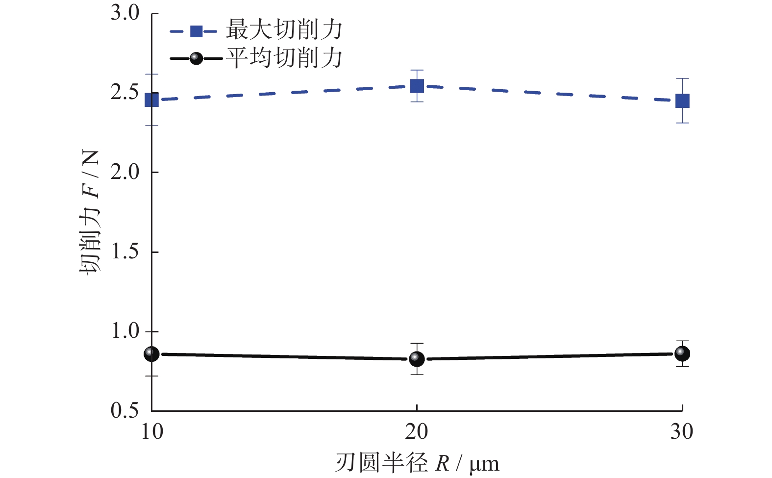 常量K1 / GPa 130.95 EPSI 1.0 K2 / GPa 0 T / GPa 0.23 K3 / GPa 0 HEL / GPa 2.79 BETA 1.0 PHEL / GPa 1.46 表 3 仿真参数 Table 3. Simulation parameters 参数名称 取值 刀具刃圆半径 R / μm 10,20,30 刀具前角 θ /(°) −15,0,15,30 切削深度 ap / μm 50,100,150,200,250 切削速度 v / (mm·s−1) 800,900,1 000,1 100,1 200