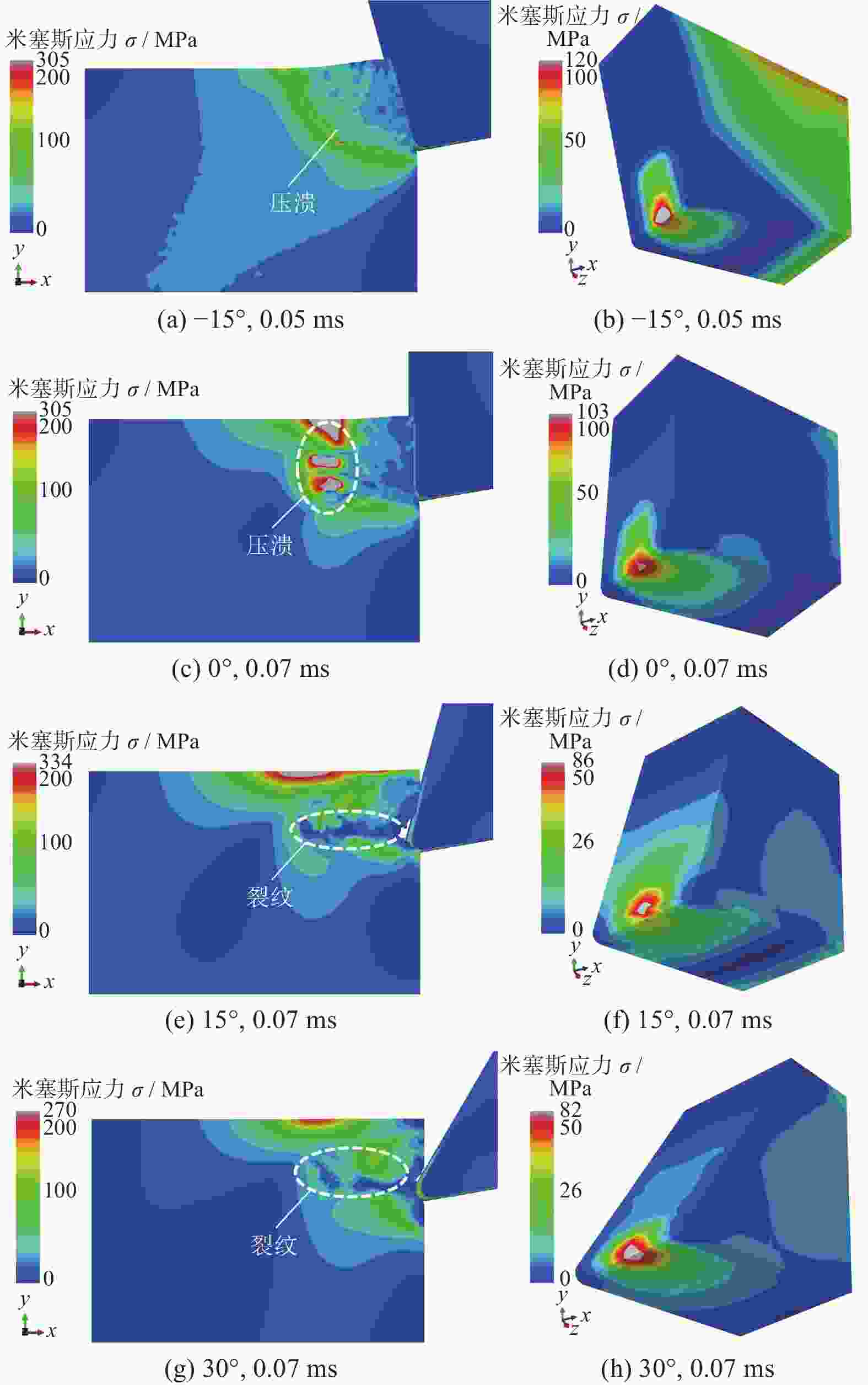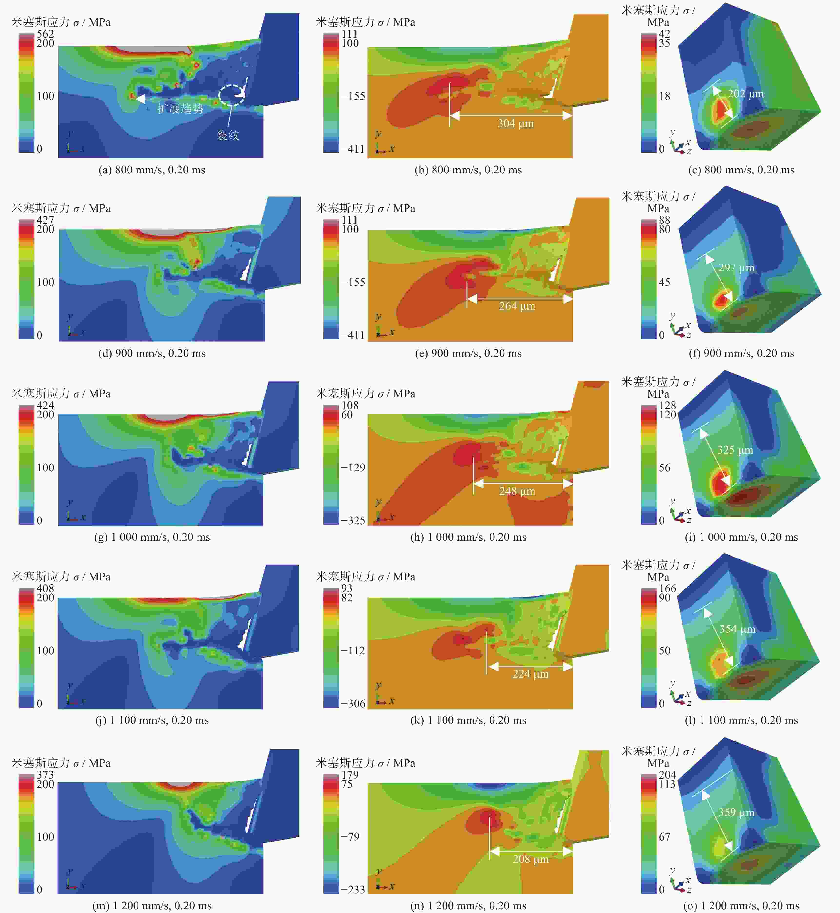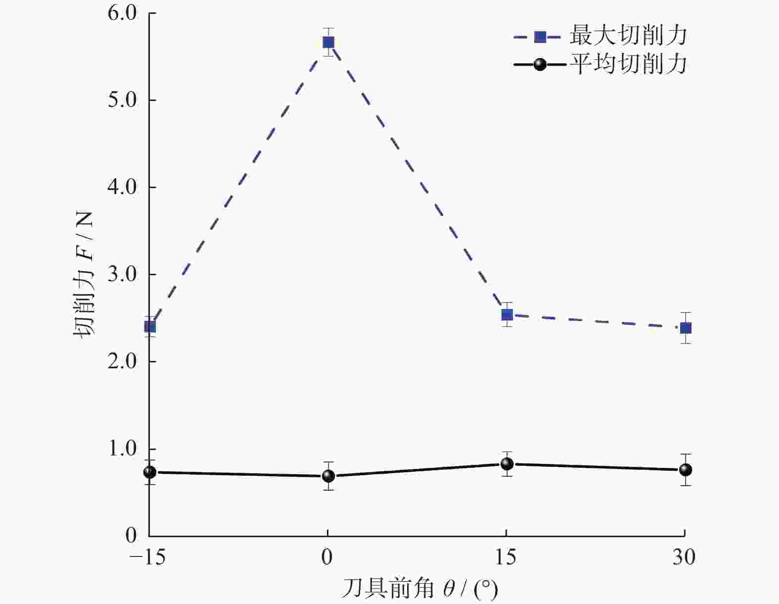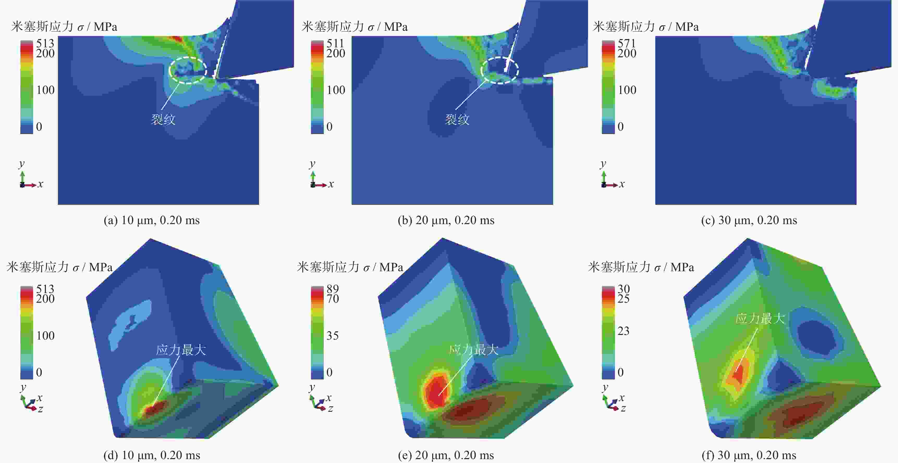 常量K1 / GPa 130.95 EPSI 1.0 K2 / GPa 0 T / GPa 0.23 K3 / GPa 0 HEL / GPa 2.79 BETA 1.0 PHEL / GPa 1.46 表 3 仿真参数 Table 3. Simulation parameters 参数名称 取值 刀具刃圆半径 R / μm 10,20,30 刀具前角 θ /(°) −15,0,15,30 切削深度 ap / μm 50,100,150,200,250 切削速度 v / (mm·s−1) 800,900,1 000,1 100,1 200