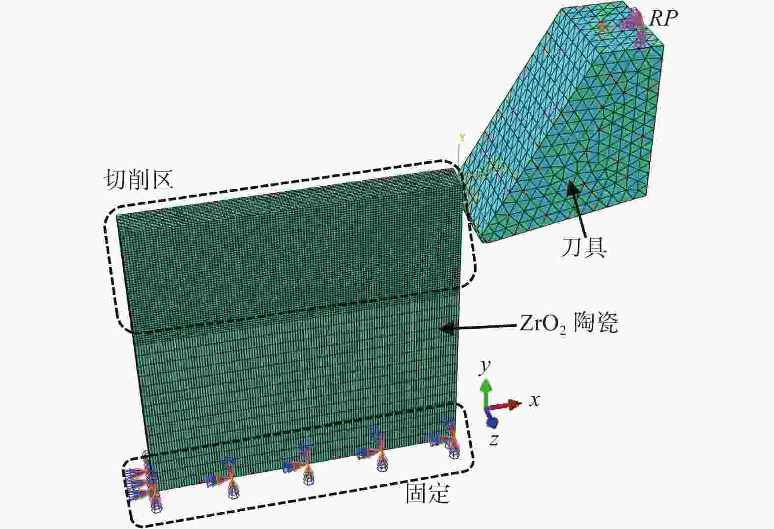表 1 材料物性参数 Table 1. Materials physical propertiy parameters 参数 ZrO2陶瓷 硬质合金刀具 密度 ρ1 / (kg·m−3) 6 050 8 120 杨氏模量 E1 / GPa 239 223 导热系数 κ / [W·(m·K)−1] 2.6 59.0 比热容 c / [J·(kg·K)−1] 400 520 泊松比 ε 0.30 0.28 表 2 ZrO2陶瓷JH-2本构模型参数 Table 2. JH-2 constitutive model parameters of ZrO2 ceramics 参数 取值 参数 取值 密度 ρ / (kg·m−3) 6 050 强度